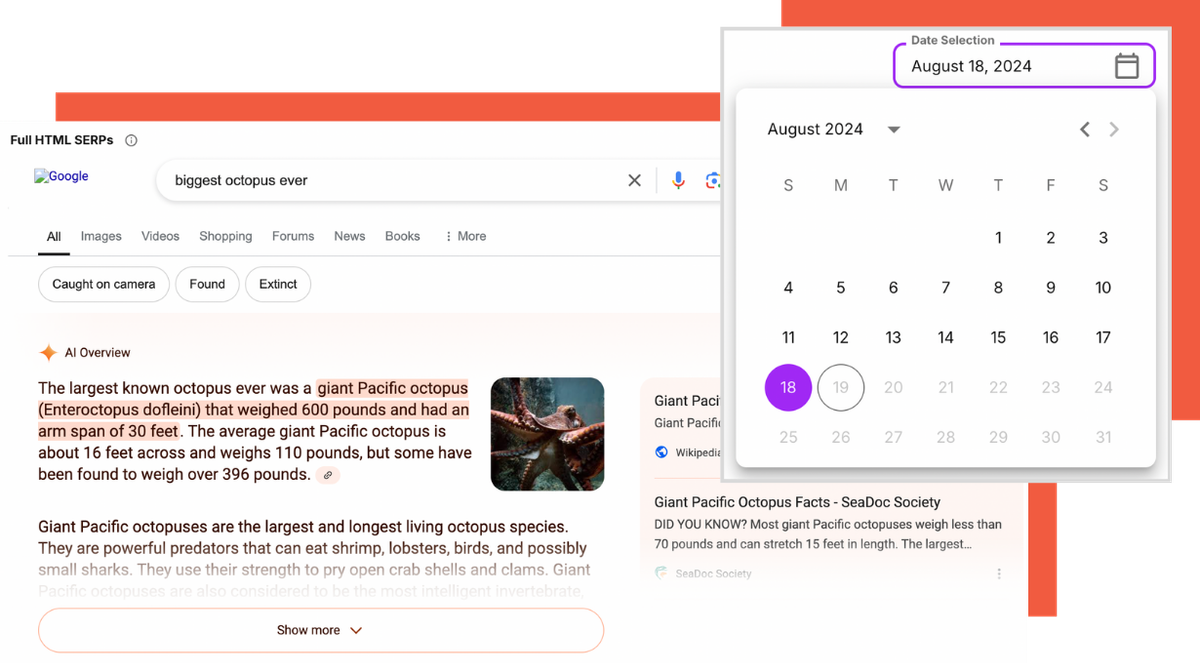 Use the full HTML SERP to understand how much before-the-scroll space AI Overviews are dominating and the kind of copy they're serving to entice searchers. Flip through your daily archive of SERP snapshots to see how this visual landscape changes.