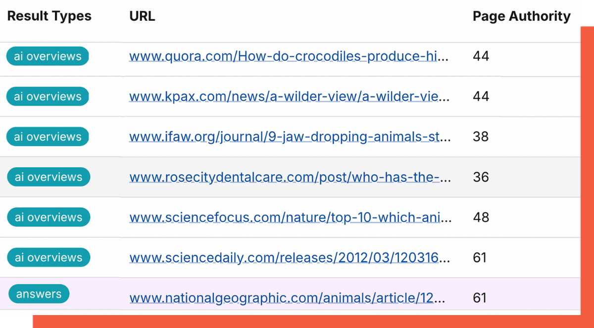 Examine the source material and Page Authority of any cited content to understand what it takes to rank in an AI Overview. Then reverse-engineer your way into an AIO-snagging content strategy.