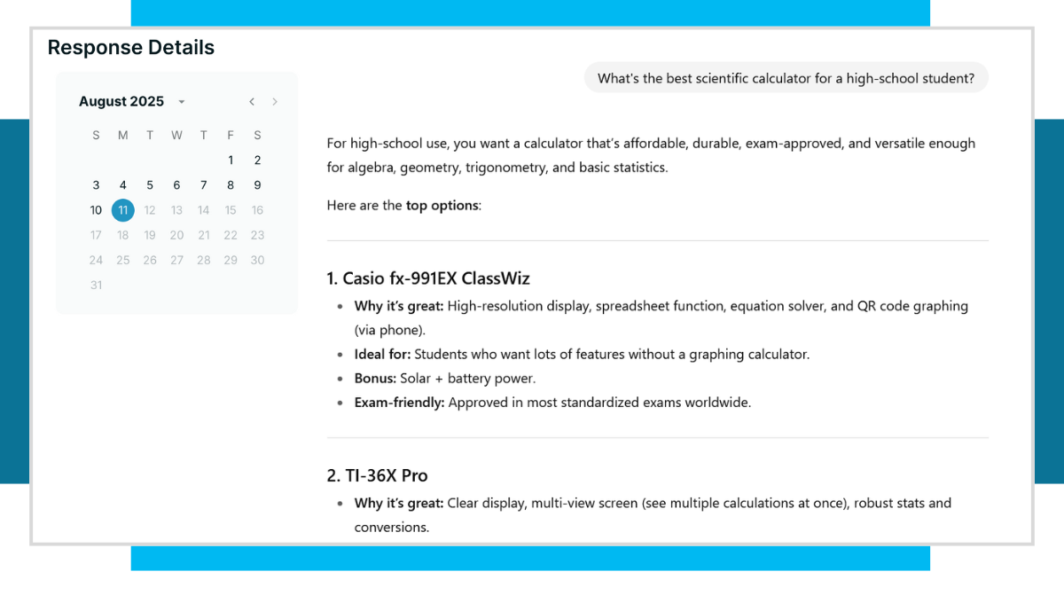 Powered by our own query fan-out method — like what drives Google’s AI Mode — you’ll get topically related, GEO-appropriate prompts suggested for you. Save time on prompt research, get up and tracking faster, and uncover the questions that steer decision-making.