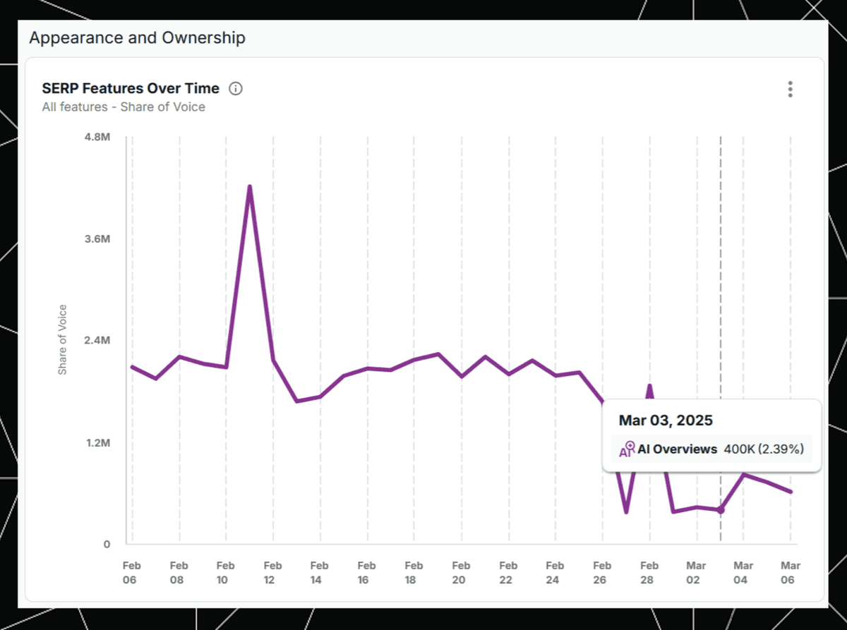STAT does all of the above, and also allows you to aggregate all of these at the site or page level. For example the chart below shows the total share of voice of AIOs (owned or otherwise) for a tag representing a specific URL of interest: