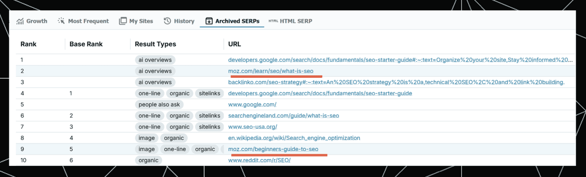 For this keyword, Moz has historically had a decent but not exceptional organic performance. Most of the competing sites are highly authoritative and not SEO-specific. However, in the AIO, Moz usually appears, often in position 1.