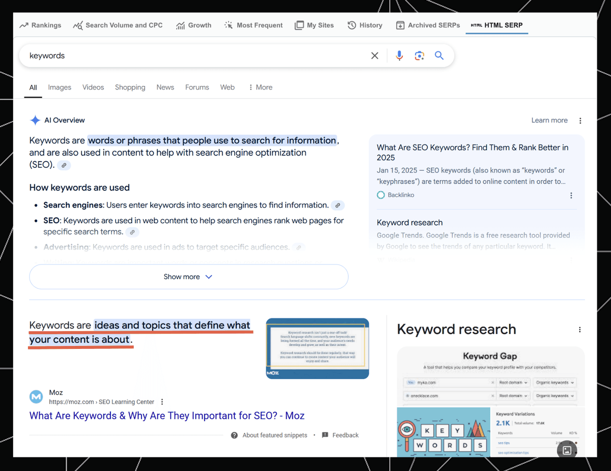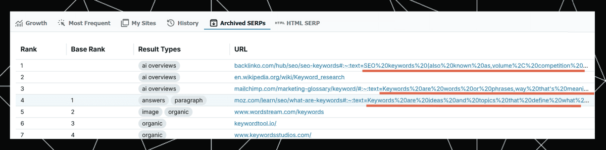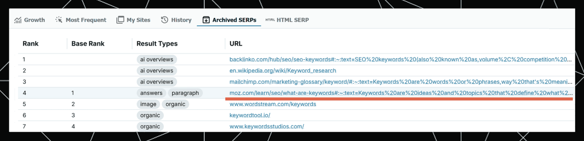 Here’s how this text ("Keywords are ideas and topics..." in the answers, paragraph result), and others, appear in these types of URLs, as seen in STAT’s archived SERP report: