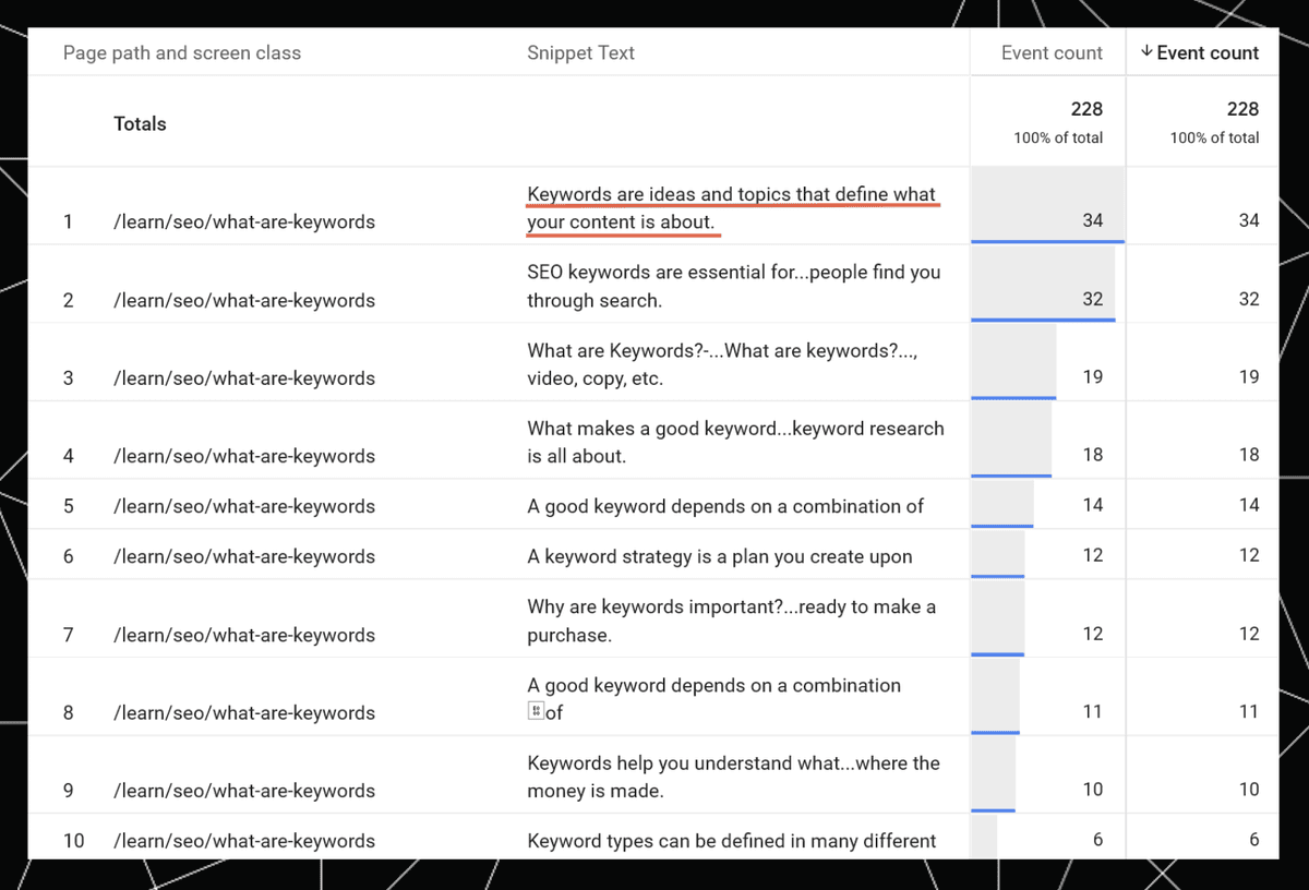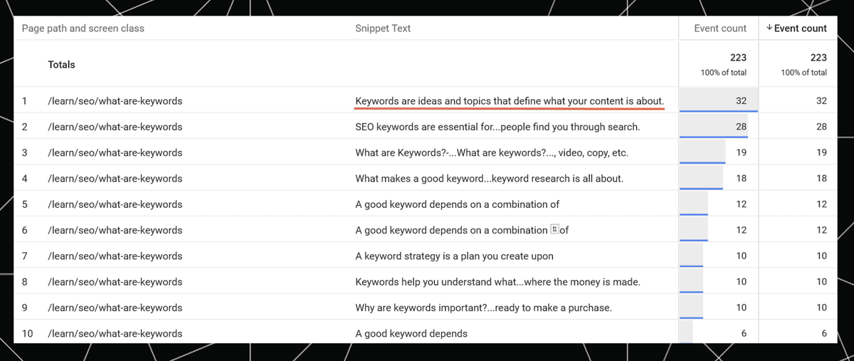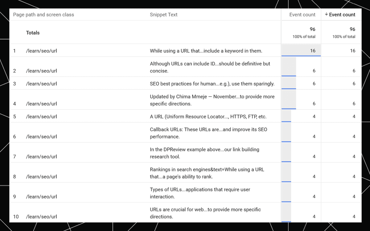 But when we look at the snippet text and event count in Google Analytics, the snippet text appearing in STAT ("URLs come in various forms...") is nowhere to be seen.