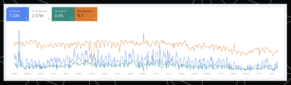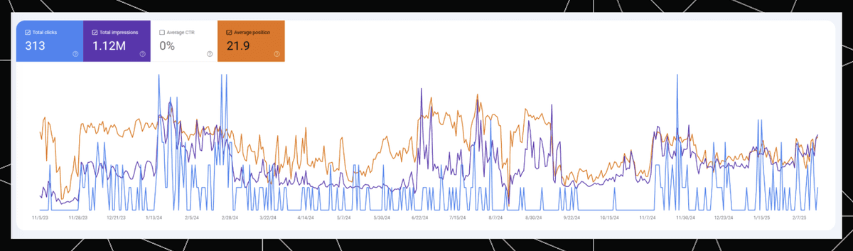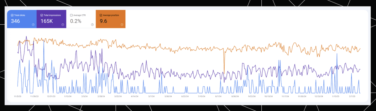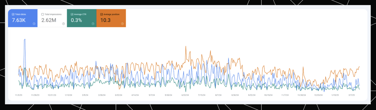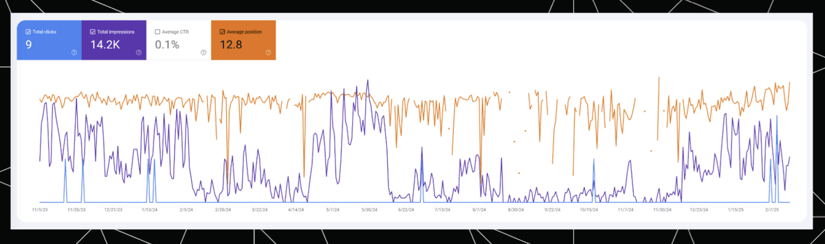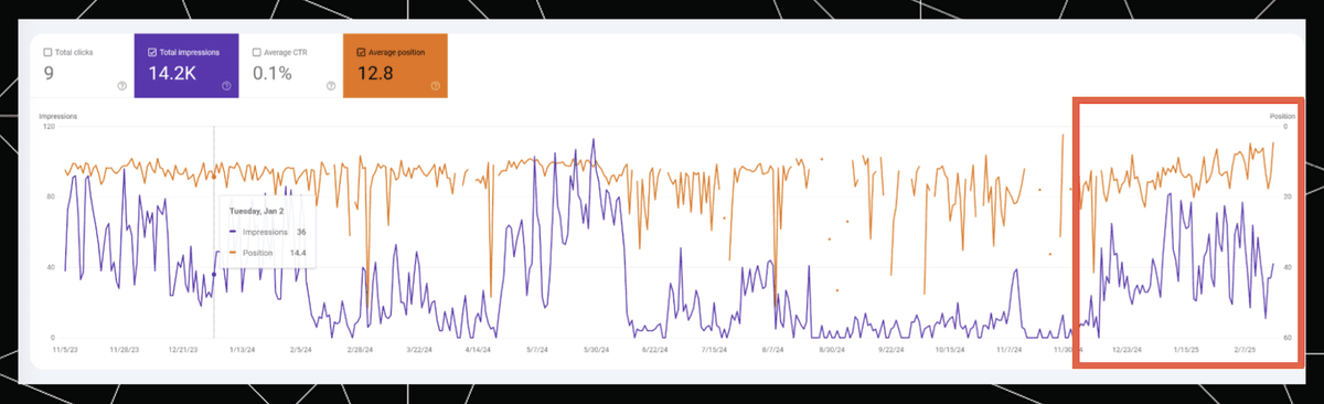 The very high Rank (blue) at the end reflects the AIO positions in the same period we see the higher impressions in Google Search Console. Meanwhile, Base Rank (orange), which only reflects traditional organic results, is more stable, mostly following the trend of “Average position” in Google Search Console.