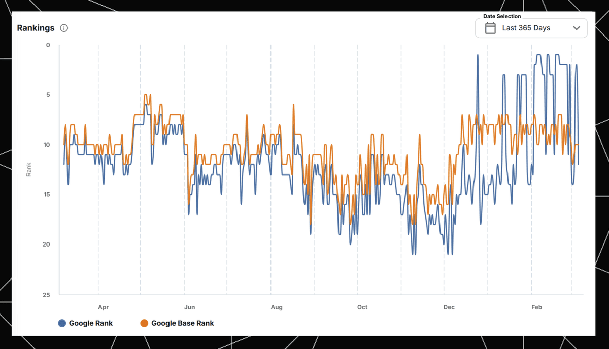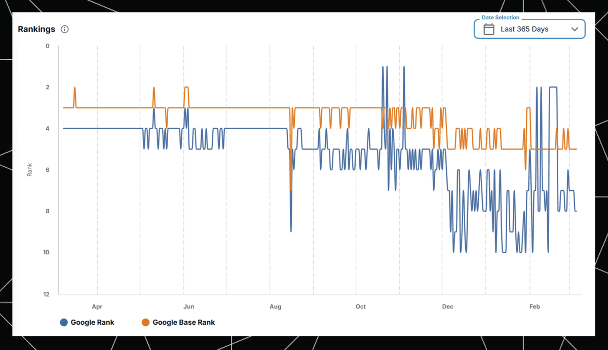 This history is visible in STAT’s Rankings chart. The orange, organic-only Base Rank has gotten a little worse, but the blue Rank line, which includes appearances in features like AIOs, occasionally spikes to position 2 when Moz is included in the carousel.
