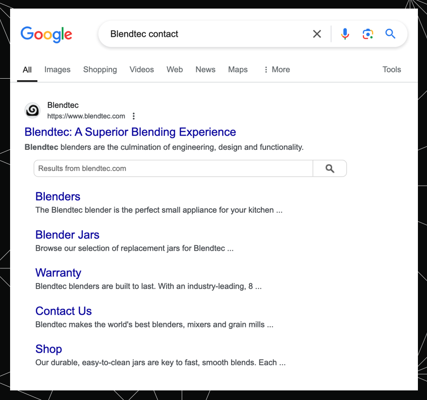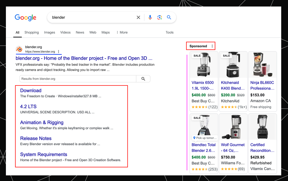 On the other hand, the keyword [blender] is much more ambiguous and the SERP does deliver a mixed intent. It serves up sitelinks for the tech interpretation, which would be navigational intent, and then, right beside it, shows sponsored ads for the smoothie-making machine, which would be transactional intent. So here we have two different meanings and two different intents.