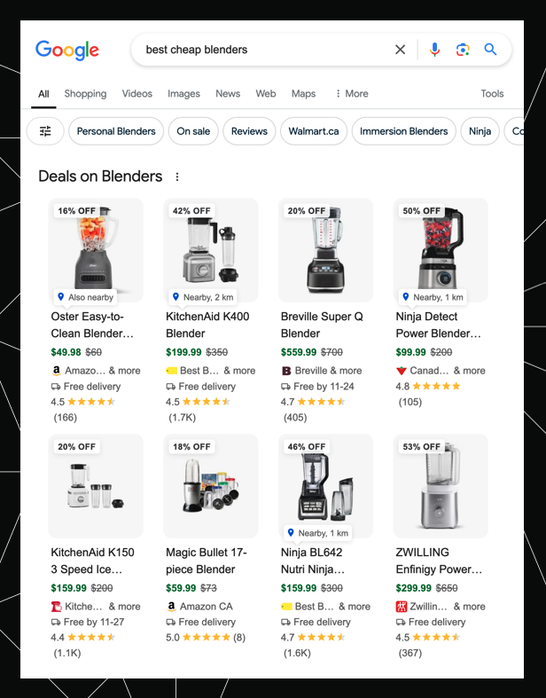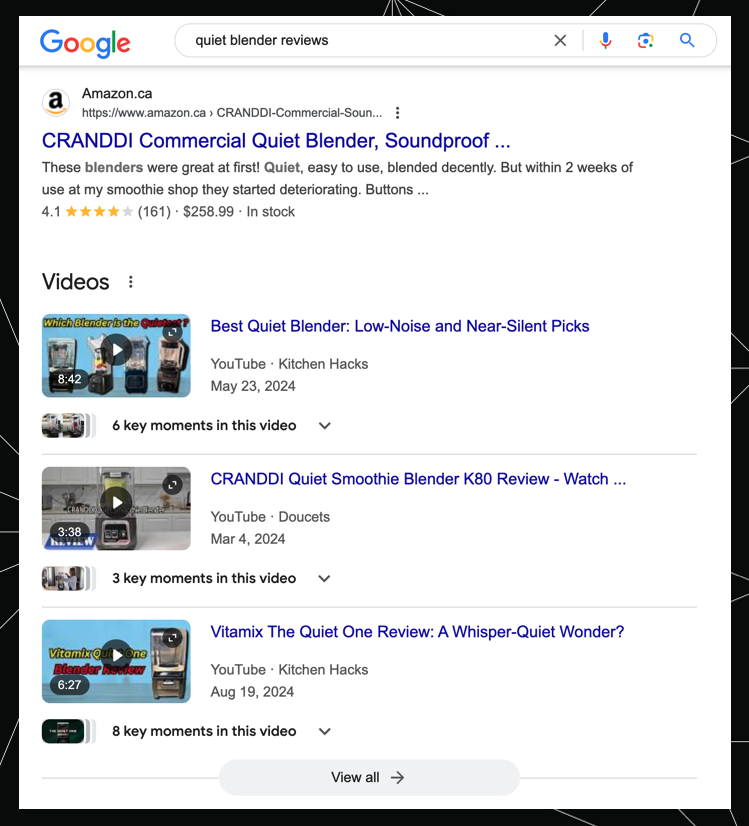 These SERPs would show lots of images, videos, and ratings and pricing snippets — all to help with the comparison shopping.