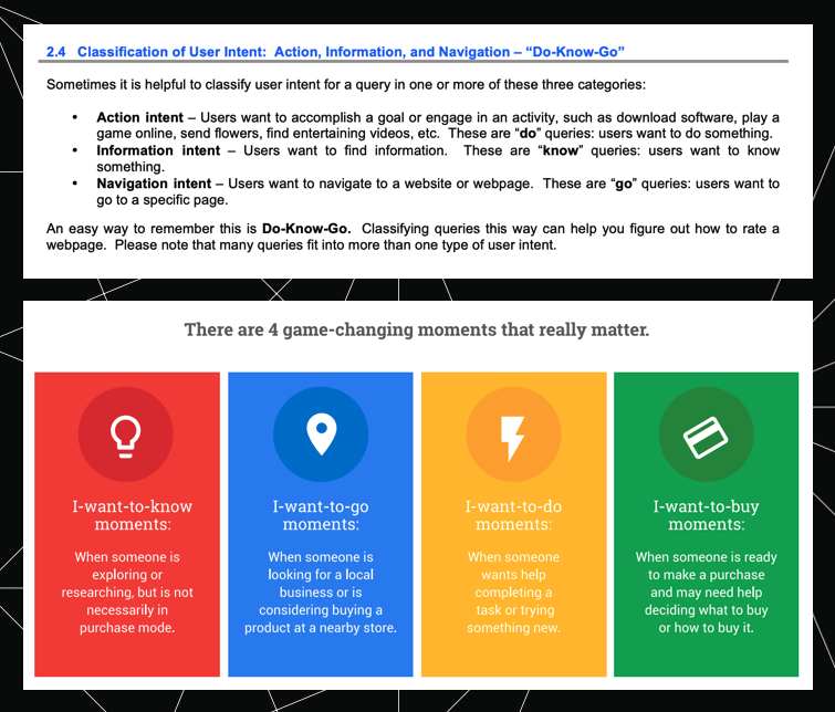 Much later, in 2015, Google seemingly hopped onto the intent scene with its Know, Go, Do, Buy “micro-moments,” though you can actually find some of these terms in their very first Search Quality Rating Guidelines from November 2012. (Interestingly, Broder joined Google in April of 2012 as a Distinguished Scientist.)