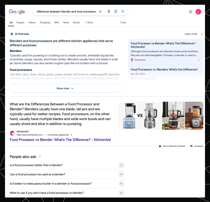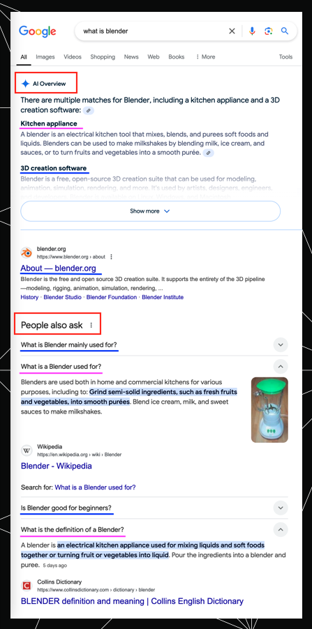 For example, the word “blender” can mean our smoothie-making kitchen appliance or a 3D computer graphics software. The keyword [what is blender] would suggest an informational intent search, and the SERP delivers just that with an AI Overview, “People also ask” box, knowledge graph, and informational videos and articles that touch on both interpretations. This is a case of two different meanings but one shared intent.