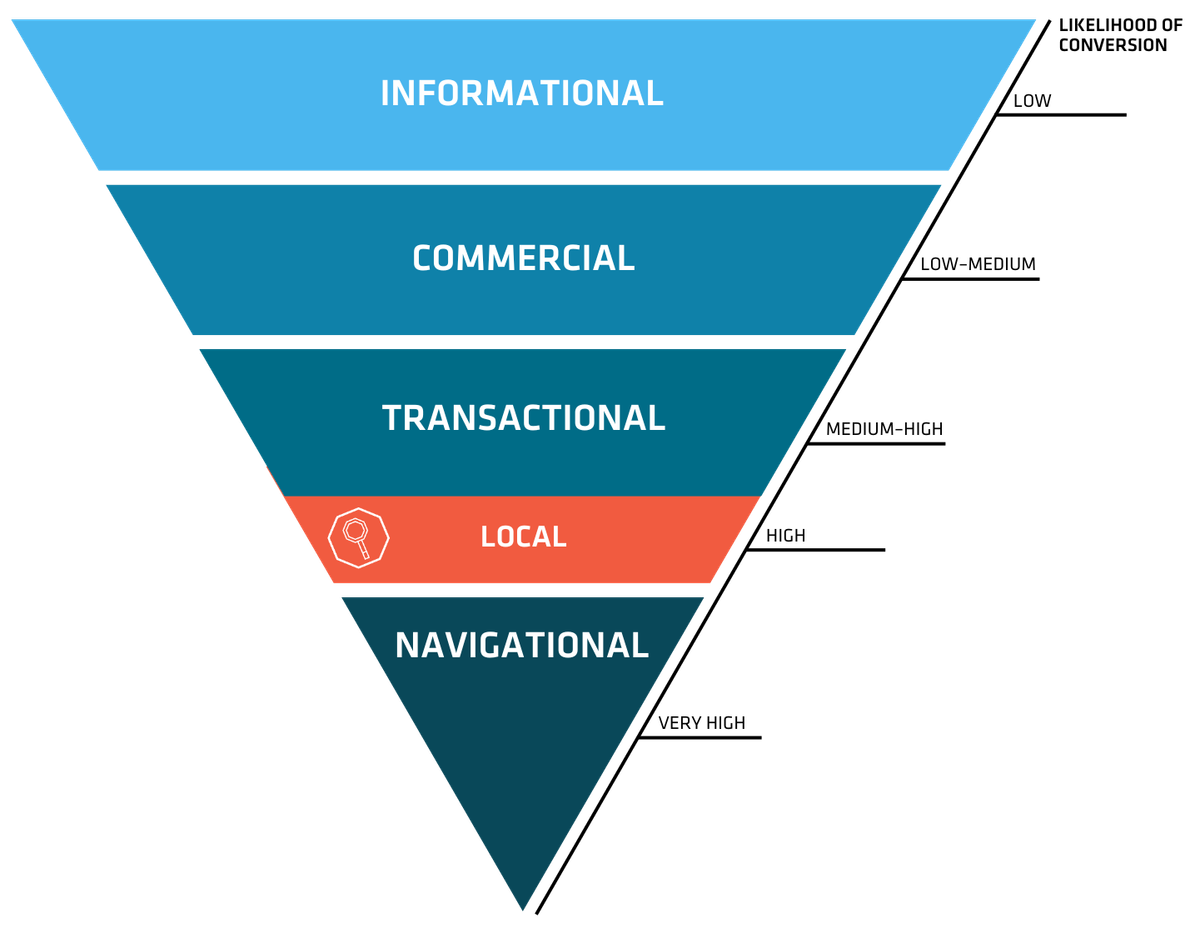 Finally we’ve reached the (beginning of the) bottom of the intent funnel, where the searcher is on the precipice of conversion. Transactional queries are the most likely to convert and generally include terms that revolve around price, brand, and location, which is precisely why we put local and navigational intent down at this end of the funnel as well.