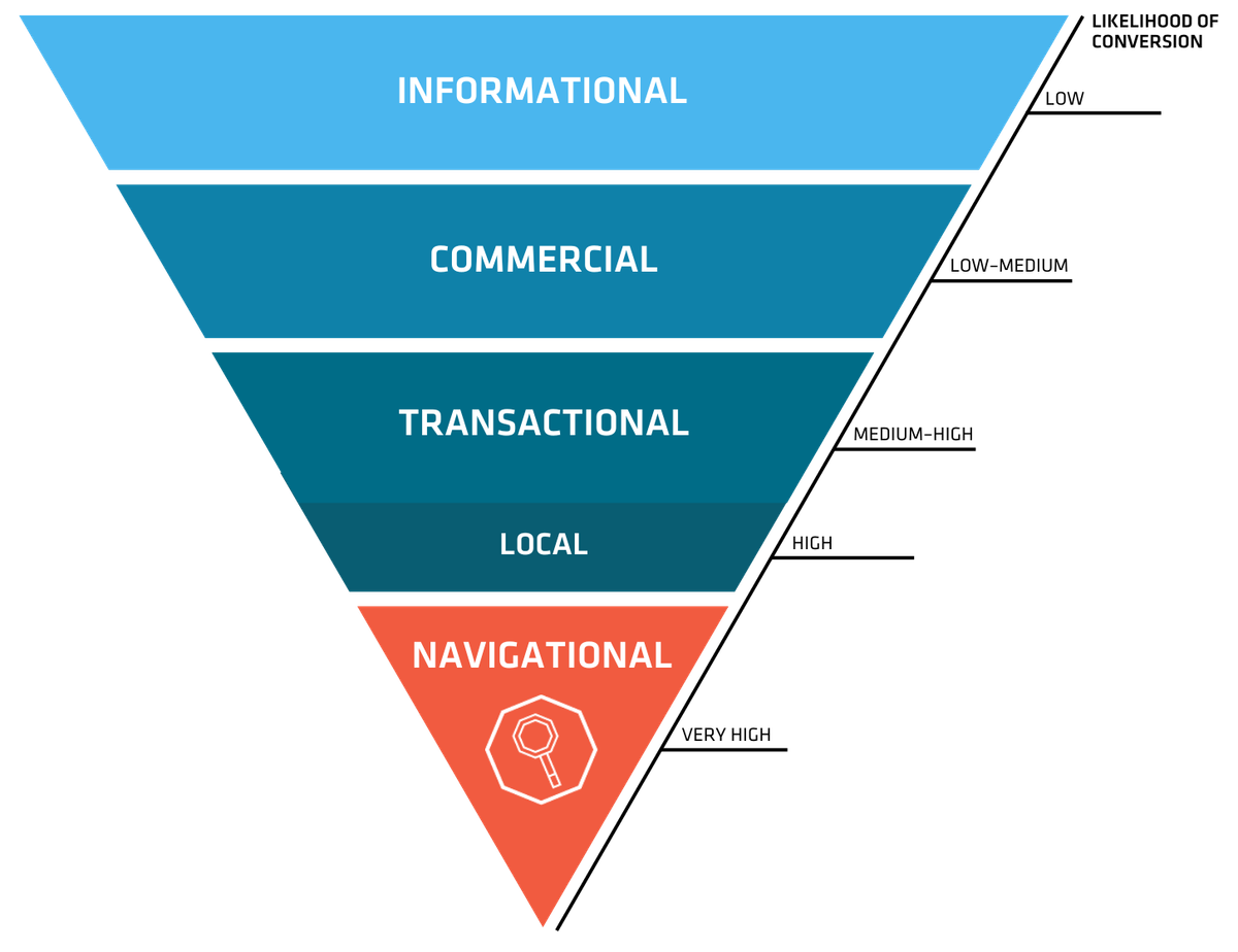 We’ve chosen to put navigational queries — searches meant to locate a specific website or page — at the very bottom of the intent journey because they often signal high buyer intent, show brand recognition, and can also indicate returning customers.
