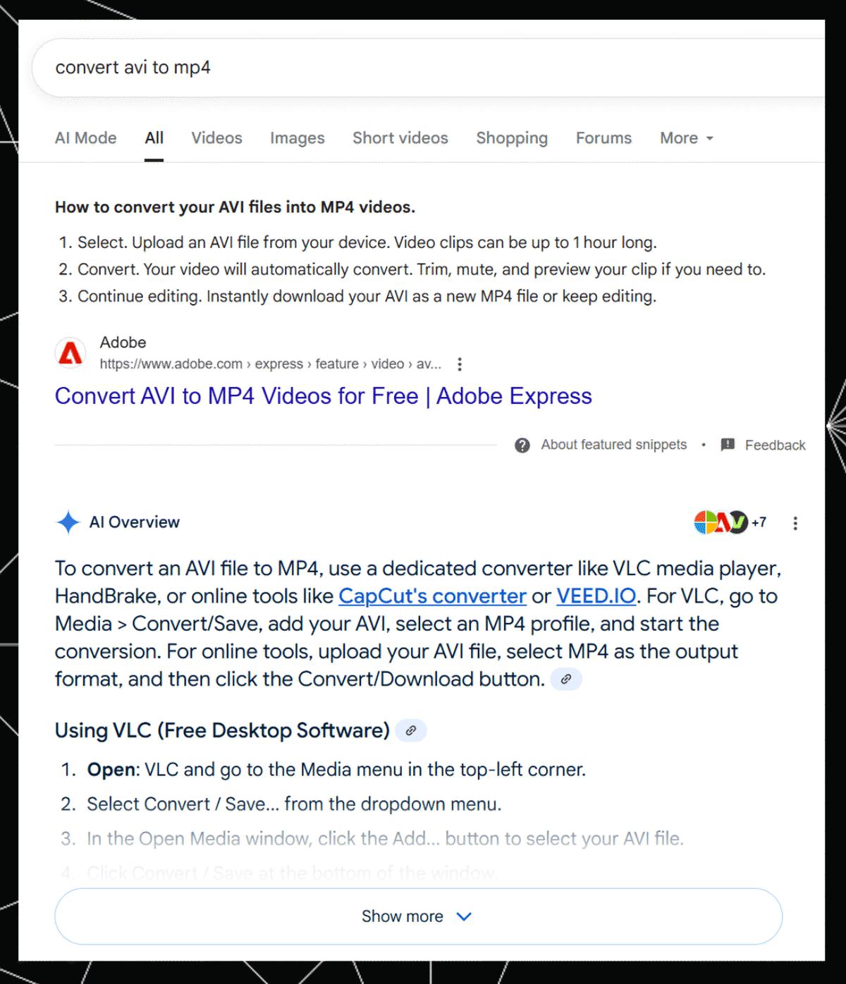 There we see Adobe ranking with a featured snippet, above an AIO, for an informational keyword.