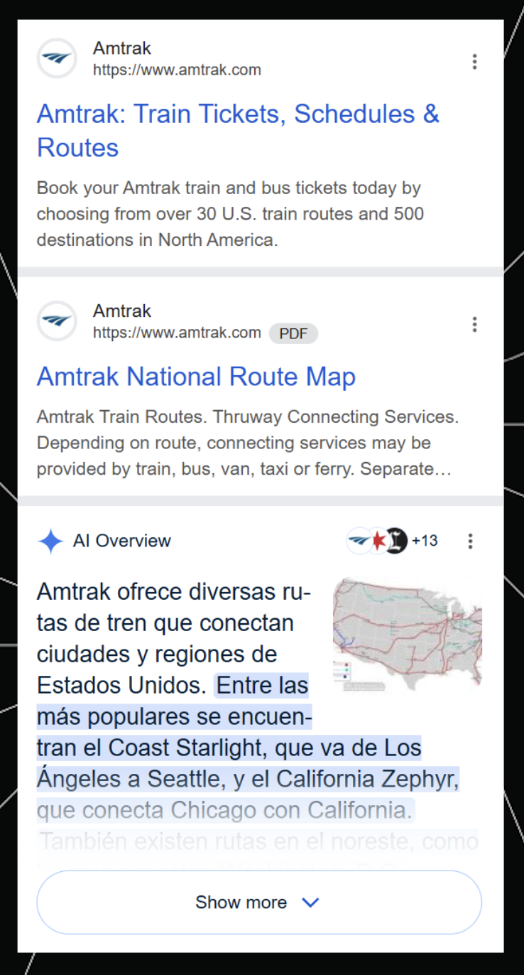 Above we see an AIO ranking in position 6, beneath several organic results, for a branded query. Weirdly, the AIO is also in Spanish, even though this result is not from a Spanish-language browser (we don’t quite know what to make of that).