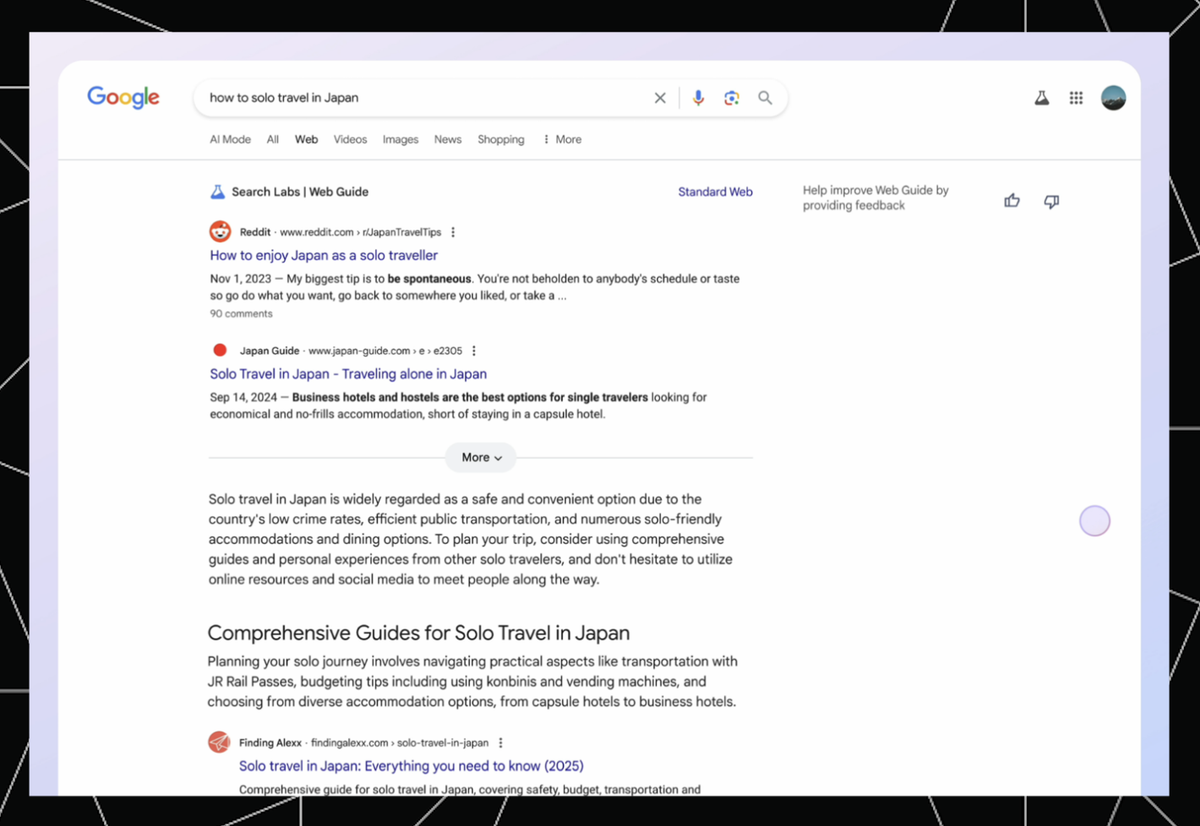 The other interesting parallel to these lower position AIOs, is Google’s new Web Guide feature — a sort of AIO/AI Mode hybrid, currently only available in Search Labs.