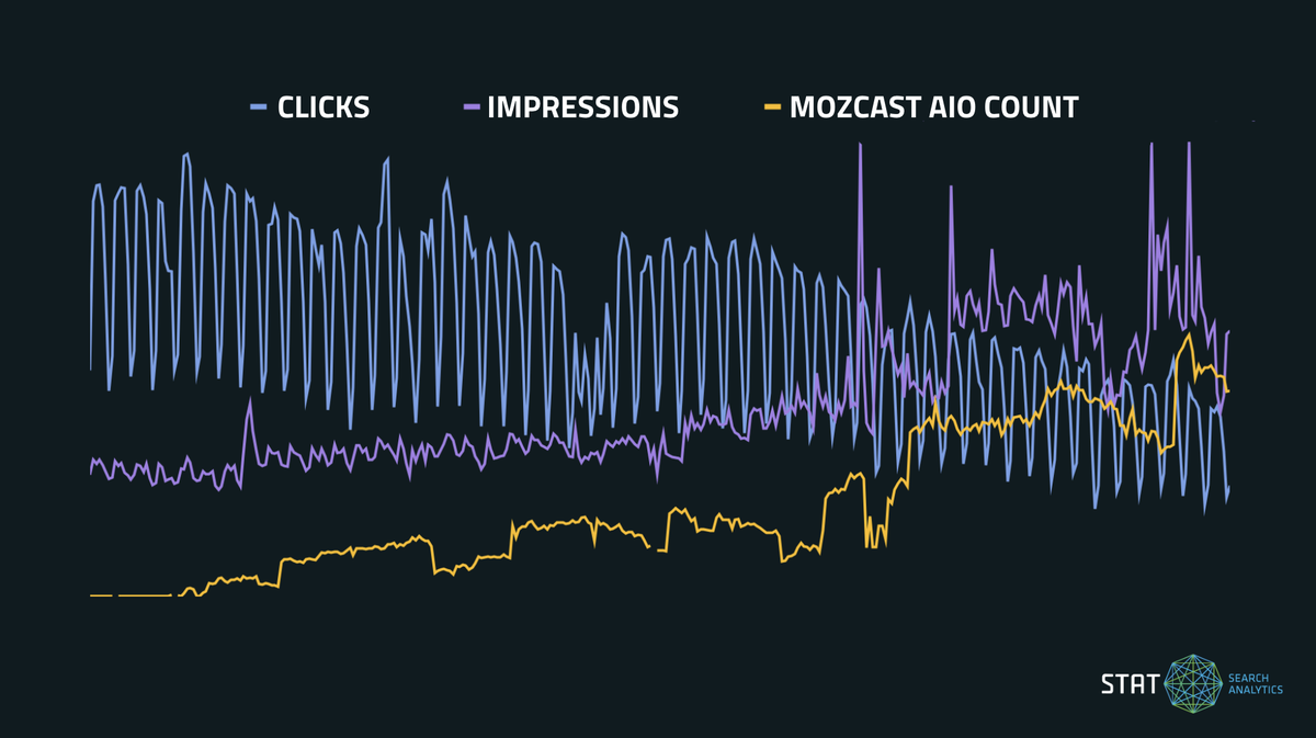 More and more questions are being answered directly within the SERP, or even in new AI interfaces like ChatGPT, AI Mode, and elsewhere — the top-of-funnel is now about brand visibility, not clicks (which is exactly why we are measuring brand visibility in AI channels in STAT alongside regular search).