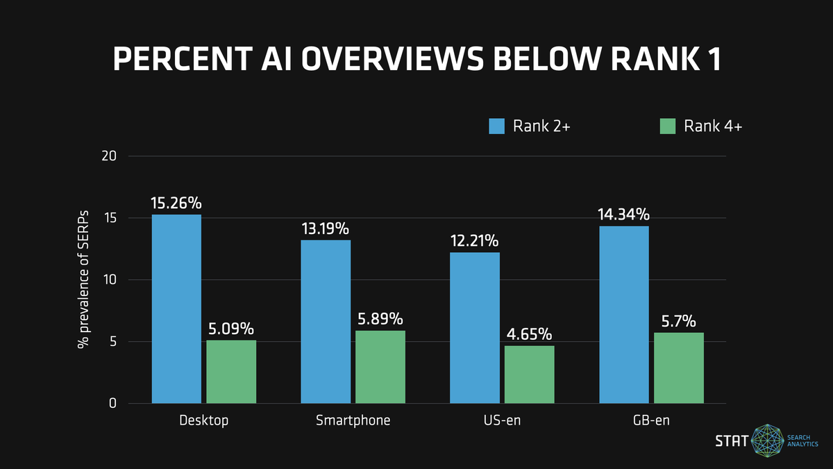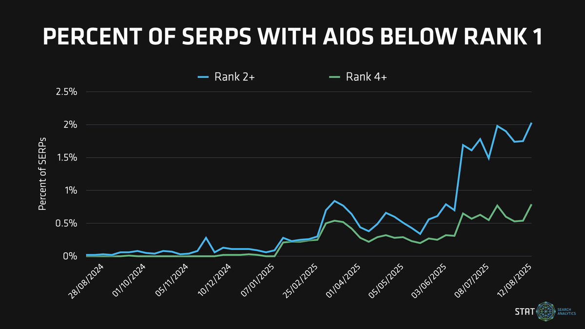 This low AIO appearance rate actually makes it all the more significant that 2% of all queries have an AIO which is in rank 2 or lower. That’s nearly 1 in 7 AIO SERPs.