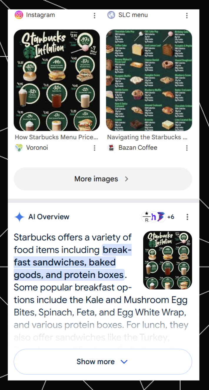 Here’s another branded query, [Starbucks food menu], with an AIO ranking in position 3, beneath both an organic result and an image carousel: